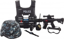 Helma, brýle, vysílačka, granát a hodinky vytvoří plnohodnotnou policejní sadu. Díky síťovanému balení máte vše přehledně pohromadě.