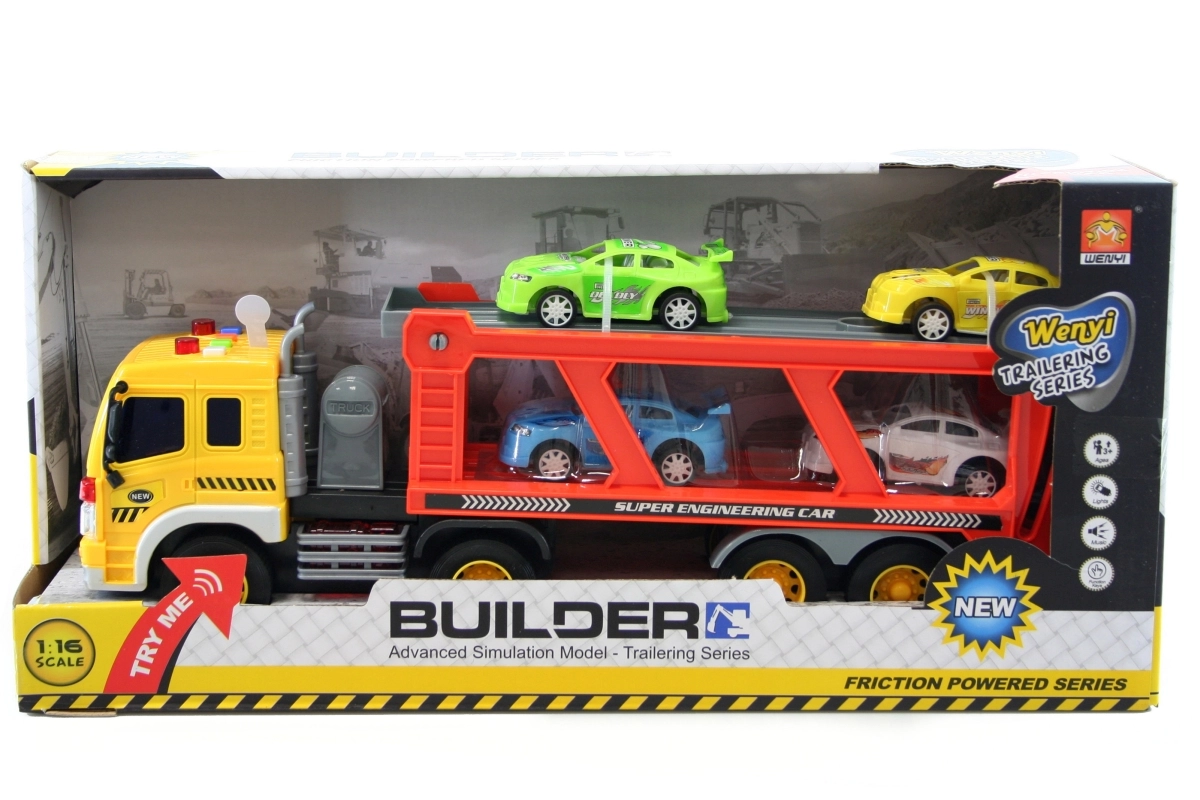 Zábavný kamionový přepravník na baterie přináší dětem od 3 let hodiny hry. Po stisknutí tlačítek svítí a vydává realistické zvuky, součástí je 4 plastová autíčka. V měřítku 1:16 a s rozměry cca 40 × 12 cm nabídne skvělou velikost pro domácí autodráhy i volnou hru.