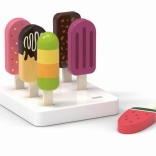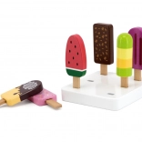 Dřevěná sada nanuků pro děti podporuje kreativní a nápodobnou hru. Sada obsahuje 6 barevných nanuků a stojan pro stylové uchování.