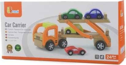 Dřevěný tahač se čtyřmi autíčky. Rozměry auta cca 28,5 x 14,5 x 8 cm. Rozměry balení cca 31 x 15,5 x 9 cm. Věk 2+