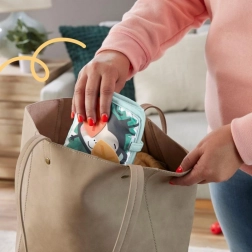 Panel snadno přizpůsobíte aktuální aktivitě: rozložte ho naplocho pro hru na bříšku, postavte do tvaru harmoniky pro hru vsedě, nebo složte do stojící kostky pro stabilní zábavu. Po skončení jej jednoduše složíte na plocho do tašky; praktické poutko umožní připnutí na kočárek a zábavu na cestách.