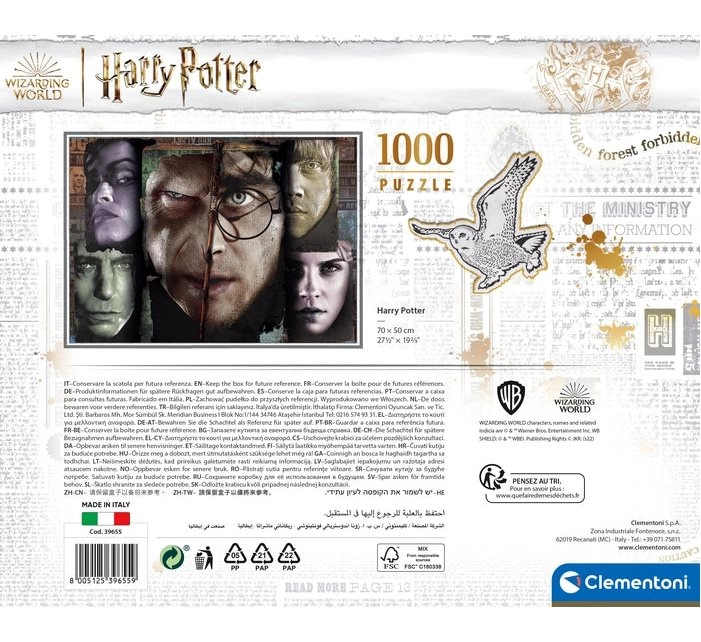 Stylové puzzle s motivem tváří kouzelníků ze světa HARRY POTTER je baleno v originálním a praktickém kufříku, který usnadňuje přenášení i skladování. Díky 1000 pečlivě vyřezaným dílkům si užijete několik hodin zábavy a relaxu při skládání detailní filmové koláže.