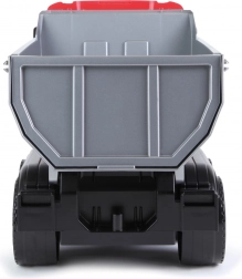 Model v moderní červeno‑černé kombinaci je vybaven pozinkovanými ocelovými osami o průměru 6 mm pro maximální odolnost. Praktická korba je sklopná a lze ji zajistit v uzavřené poloze, takže snadno převeze písek, kamínky i další náklad.