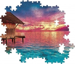 Ponořte se do meditativního rytmu skládání s puzzle CLEMENTONI Peace – Living the Present. Syté barvy, pečlivý tisk a dokonale padnoucí dílky zajišťují příjemný zážitek a krásný obraz chatky na kůlech nad klidnou hladinou při západu slunce.