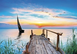 Scéna s molem, plachetnicí a západem slunce podporuje relaxaci a přináší do domova atmosféru ticha a pohody.