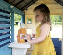 Domeček zahrnuje 18 různých plastových doplňků jako nádobí a hračka na jídlo, které rozvíjejí představivost a kreativitu dítěte.