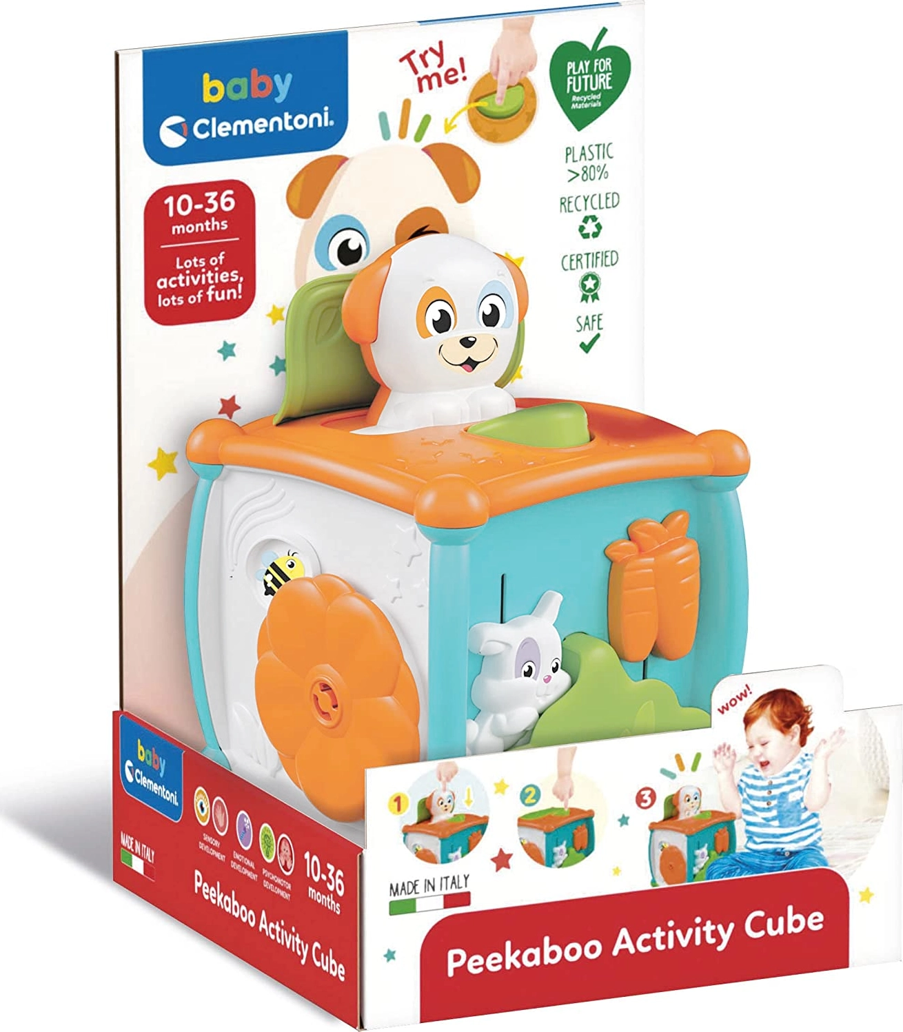 Produkt je součástí ekologického programu Clementoni Play for Future, který děti učí důležitosti udržitelnosti. Rozměry kostky jsou 14 x 14 x 14 cm. Barevné provedení se může lišit.