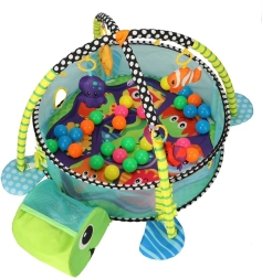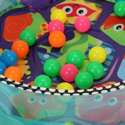 • 3 způsoby hry: na zádech pod hrazdičkou, na bříšku pro posílení svalů, vsedě v míčkovém bazénku.
