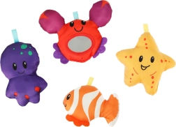 Rybička, chobotnice, hvězdice a krab se zrcátkem podněcují zrak, hmat i koordinaci oko–ruka a lákají dítě ke zkoumání a úchopu.