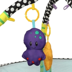 Součástí jsou měkké hračky ve tvaru rybičky, chobotnice, hvězdice a kraba se zrcátkem, které rozvíjejí zrak, hmat i pozornost. Lehká konstrukce se rychle skládá, takže je ideální na cesty i do menších prostor.