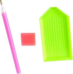 - Kompletní sada: plátno s předtištěným motivem, aplikační pero, miska, vosk a sada barevných kamínků.