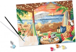Vše máte připravené k okamžitému tvoření – stačí otevřít balení a začít malovat. Očíslované kelímky s akrylovými barvami na vodní bázi se snadno zavírají, aby barvy nevysychaly, a kvalitní štětec s jemnou špičkou zvládne i drobné detaily motivu pláže.