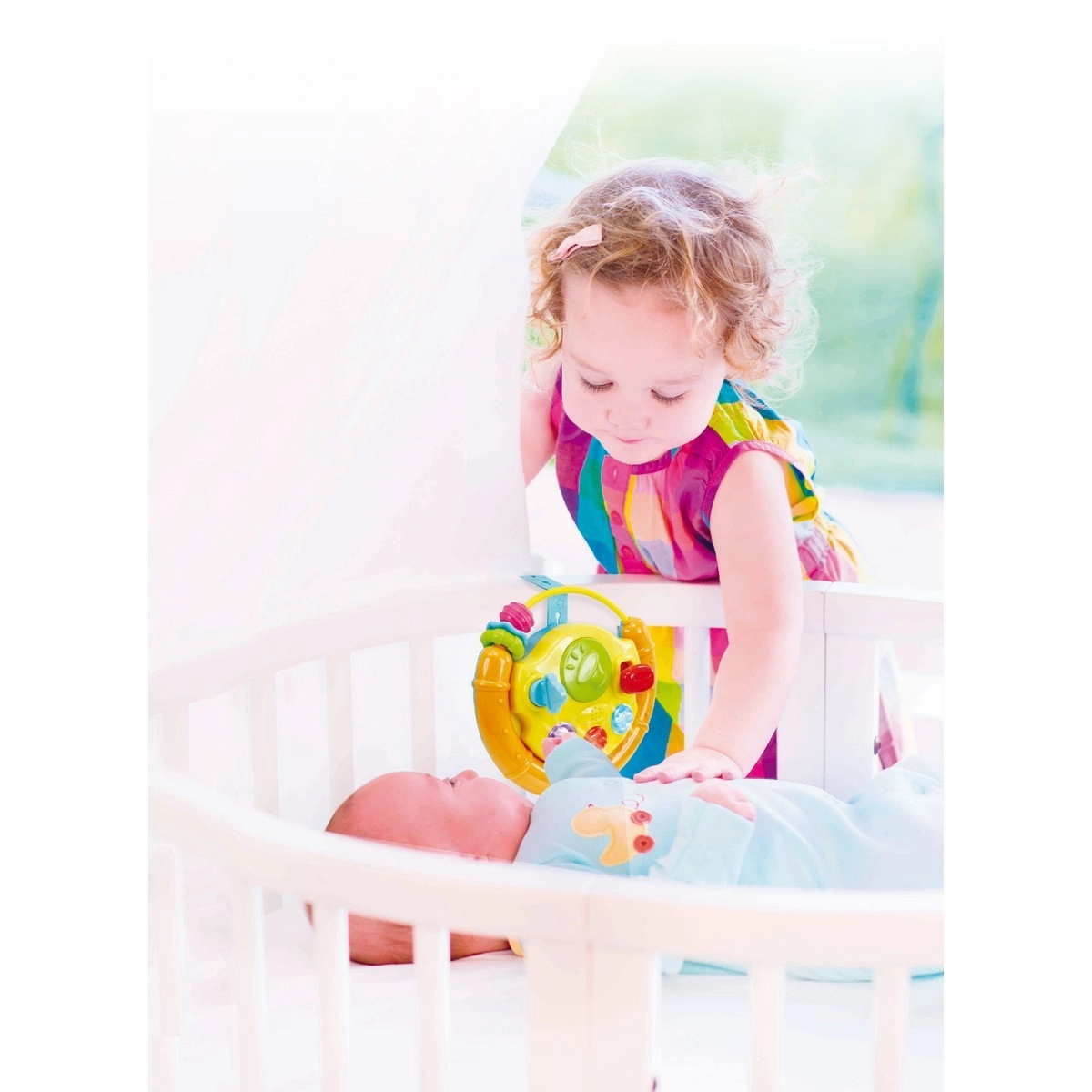 Díky praktickému popruhu hračku snadno připevníte na postýlku, autosedačku nebo kočárek. Otočná stacyjka s klíčkem, funkční tlačítka a točící prvky prodlužují dobu hraní a pomáhají rozvíjet sluch, zrak i motorické dovednosti.