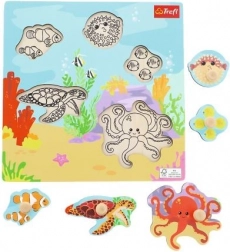 Dřevěné puzzle Podmořská zvířátka potěší nejmenší barevnou grafikou a jednoduchým skládáním. 5 vyjímatelných dílků s dřevěnými úchyty se snadno drží, podklad s vyfrézovanými tvary a černobílou předlohou pomáhá s umístěním. Skvělá hračka pro rozvoj jemné motoriky a učení rozpoznávání tvarů již od 18 měsíců.