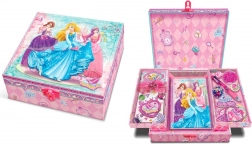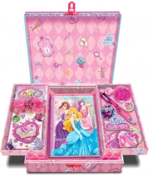 Objevte kouzelný dárkový set v dekorativní krabičce s motivem Princess. Dvě boční poličky se snadno vyklápějí a pod nimi se skrývá deníček na tajná přání a zážitky. Perfektní pro ukládání drobností i každodenní psaní.