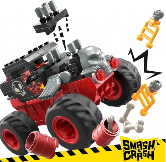 Postavte si vlastní monster truck a předveďte odvážné skoky s rampou! Tato stavebnice HOT WHEELS Mega Bone Shaker Crush Course přináší 151 dílů, z nichž sestavíte robustní auto s pull-back pohonem, rampu a doplňky pro akční kaskadérské jízdy. Široké pneumatiky, červeno-černá karoserie s plameny a lebkou a možnost odpadnutí ozdoby při nárazu zaručují nekonečnou zábavu.