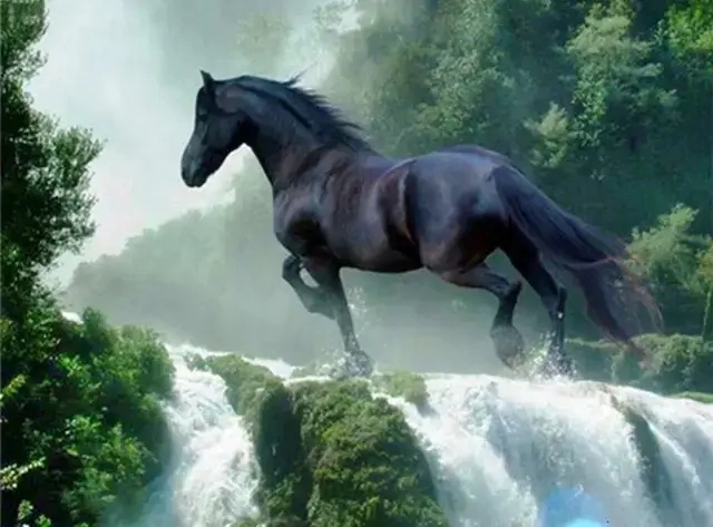 Téma černého koně nad vodopádem zaujme svou silou a dramatickým kontrastem a přinese do vašeho domova kousek přírodní krásy.
