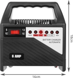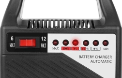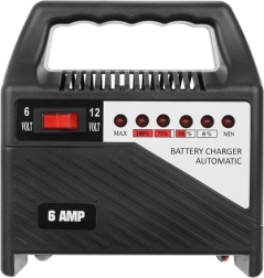 Kompaktní automatická nabíječka pro baterie 6 V i 12 V s nabíjecím proudem až 6 A. Ideální pro autobaterie, motobaterie a olověné akumulátory 20–65 Ah. Nabízí přepínač napětí, LED indikaci úrovně nabití a nízkou hmotnost pro snadné přenášení.