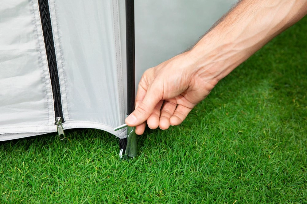 Altán postavíte přibližně za 15 minut. Stabilitu zvyšují napínací šňůry a kolíky, které pevně ukotví konstrukci v terénu.