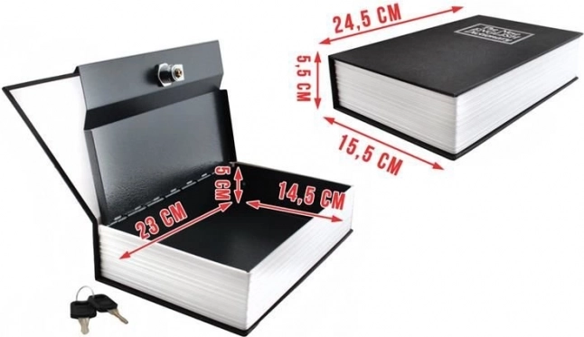 Diskrétní sejf ve tvaru knihy se vzhledem anglického slovníku splyne s knihovnou a bezpečně ochrání vaše cennosti. Uvnitř je kovová schránka se zámkem na klíč, ideální pro domov, kancelář i hotel. Skvělé řešení pro nenápadné uložení peněz, šperků a dokumentů.