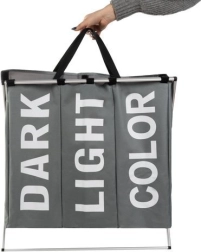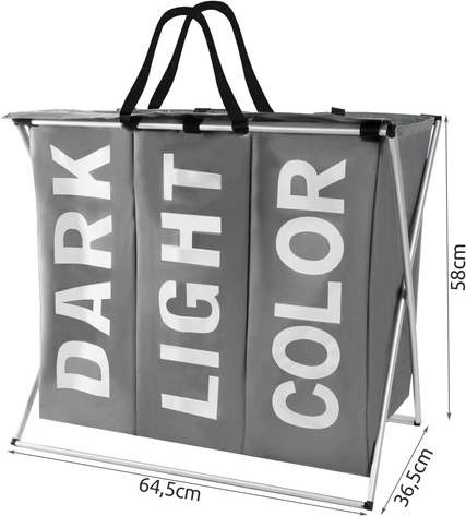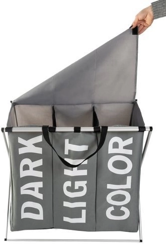 Praktický tříkomorový koš na prádlo s pevnou kovovou konstrukcí a textilním tělem usnadní každodenní třídění. Díky přihrádkám DARK, LIGHT a COLOR budete mít prádlo vždy přehledně roztříděné. Vnitřní voděodolná úprava, víko na suchý zip a pohodlné úchyty zaručují čistotu, pořádek a snadné přenášení až do pračky.