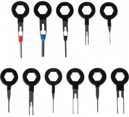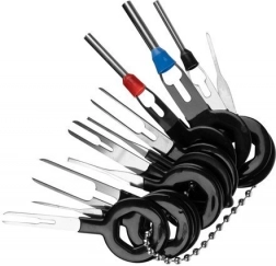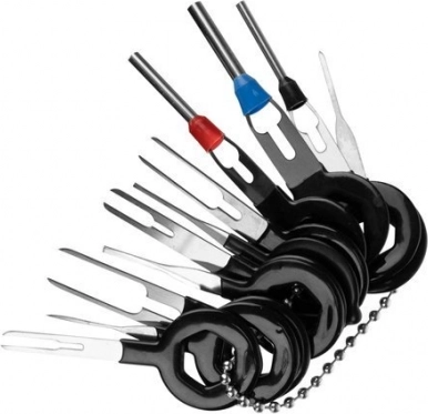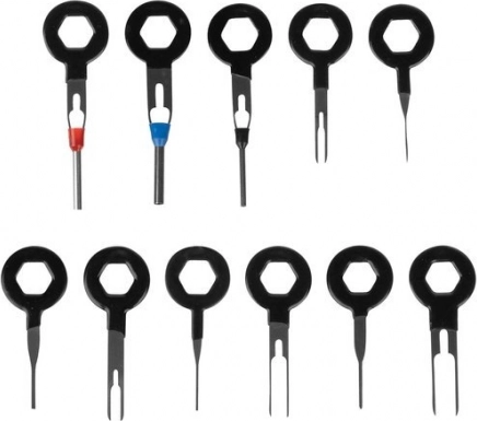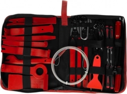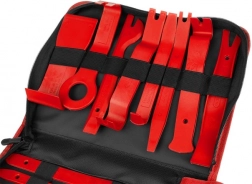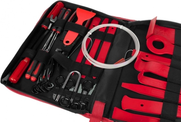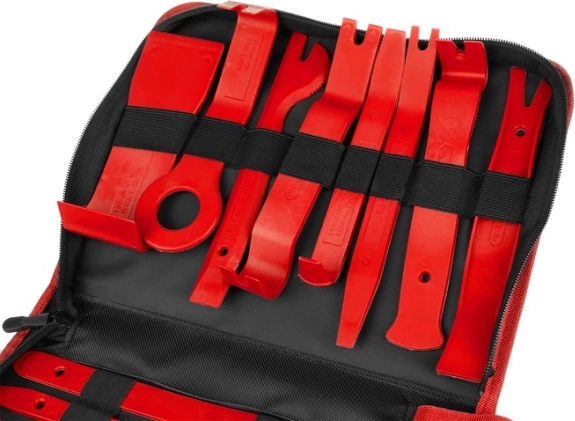 Vše, co potřebujete pro demontáž interiéru: 12 plastových páčidel, kleště na spony, 2 vyndavače klipů (22,5 a 31 cm), 8 klíčů pro rádio, 11 klíčů na piny a 4 háčky. Přehledně uloženo v odolném zipovém pouzdře.
