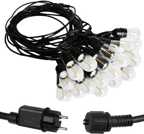 SPECIFIKACE- žárovky: E27; konstantní záře; vzdálenost mezi kuličkami: 50 cm; měděný drát; vodotěsné: IP44; možnost kombinování; vstupní napětí: 220-240V; výstupní napětí: 24V; 20 žárovek; barva světla: teplá bílá; celková délka: 1160cm; délka kabelu s lampami: 1000cm; průměr žárovky: 4cm; hmotnost: 2 376 kg.