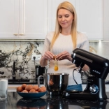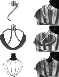 Součástí robota jsou tři různé nástavce: šlehač, hnětač a míchač. Nezbytné nástroje pro dokonalou přípravu těst, krémů a všech vašich oblíbených pochoutek. Kromě toho zahrnuje stylové příslušenství jako cukrářský sáček, koncovky a separátor k oddělování vajec.