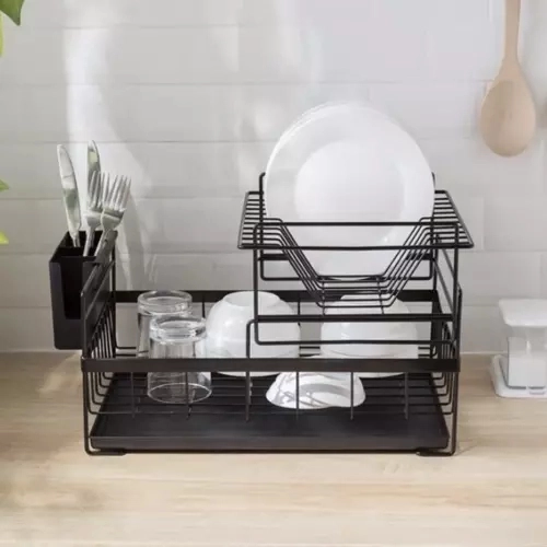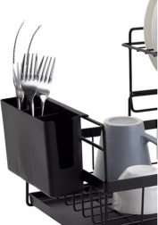 Součástí je odnímatelný košík na příbory se dvěma oddělenými komorami pro přehlednou organizaci a snadno omyvatelný odkapávací tác, který zachytí vodu a udrží kuchyňskou linku v suchu. Univerzální černé provedení a čisté linie v loft stylu perfektně zapadnou do moderní i klasické kuchyně.