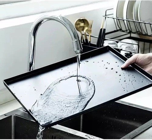 Hladký plastový tác zachytí stékající vodu a udrží pracovní plochu suchou. Po umytí jej jednoduše opláchnete pod tekoucí vodou – údržba je otázkou chvilky.