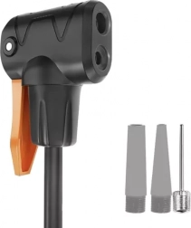 Univerzální dvouportová hlavice s páčkou pro rychlé zajištění pasuje na auto i cyklo ventily. V sadě jehla na míče a 2 kuželové nástavce pro matrace a další nafukovadla.