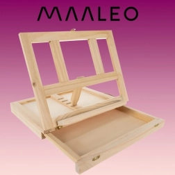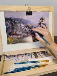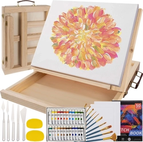 Kompletní malířská sada v dřevěném kufříku se sklopnou stolní štafleí nabízí vše, co potřebujete pro tvorbu doma i na cestách: 46 dílů, akvarelové barvy, sada štětců, špachtle, plátna a skicák A4. Díky integrované zásuvce a pevné kovové přezce máte pomůcky bezpečně uložené, přenos usnadní pohodlné madlo.
