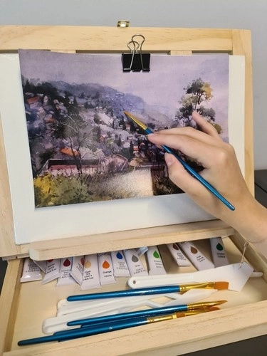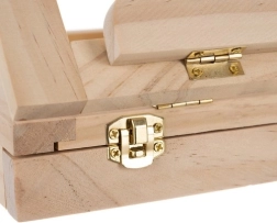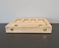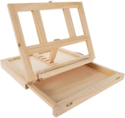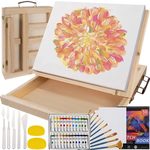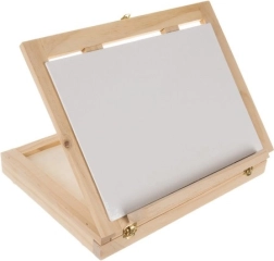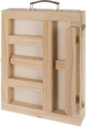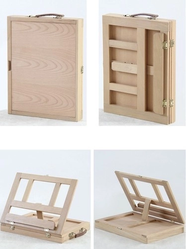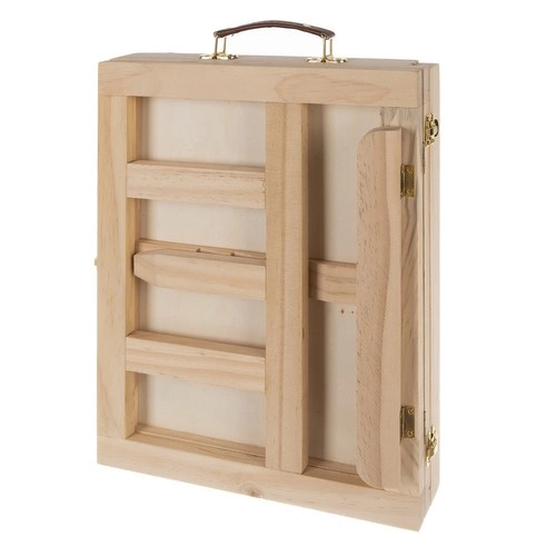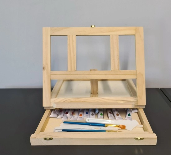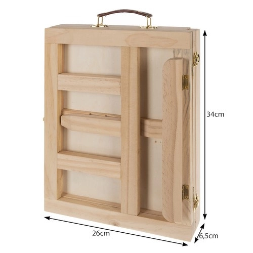 Tento přenosný malířský kufřík z borovicového dřeva se po otevření promění v stolní štafle s nastavitelným sklonem. Všechny pomůcky jsou přehledně uloženy v zásuvce a organizovaných přihrádkách, takže se můžete plně soustředit na tvorbu – ať už začínáte, nebo hledáte kompaktní set na cesty.