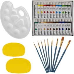 Sada obsahuje akvarelové barvy v tubách, paletu na míchání, 9 štětců, 5 špachtlí, 2 houbičky, 3 plátna a skicák A4 – připraveno k malbě hned po rozbalení.