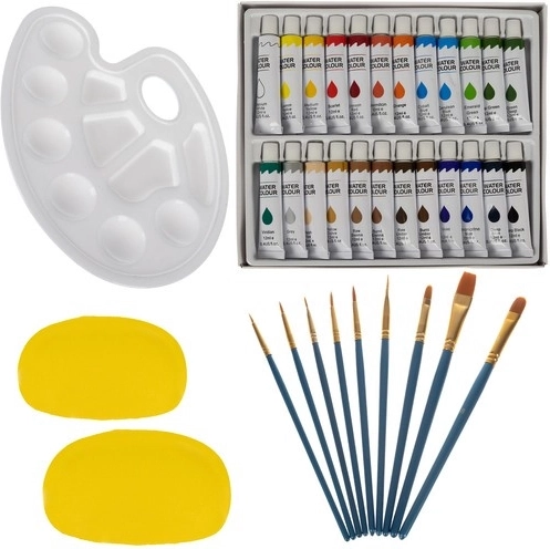 - kufřík se štafleí a zásuvkou, skicák A4 (1×), plastová paleta (1×), houbička (2×), malířské plátno (3×), štětec (9×), akvarelové barvy v tubách (24×), malířská špachtle (5×)