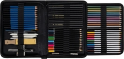 Tato univerzální sada na kreslení, malování a skicování nabízí bohatý výběr grafitových a uhelných tužek, akvarelových, metalických a klasických pastelek, společně s praktickými pomůckami pro stínování a detaily. Pevné textilní pouzdro udrží všechny potřeby organizované a připravené k použití doma i na cestách.