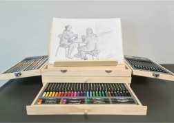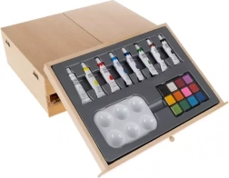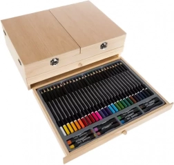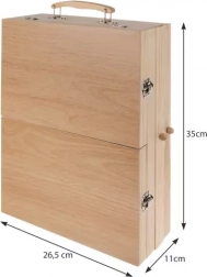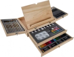 Kompletní 83dílná výtvarná sada v dřevěném kufříku se zabudovaným stojanem-easelem pro malování doma i na cestách. Uvnitř najdete vše potřebné: akrylové a akvarelové barvy, štětce, grafitové tužky různé tvrdosti, pastely, barevné pastelky, paletu i skicák. Praktický dřevěný kufřík s rukojetí a 2 výsuvnými zásuvkami zajistí perfektní pořádek a rychlý přístup ke všem pomůckám.