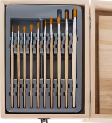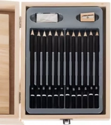 - kufřík se stojanem, skicák, 10× štětec, 12× grafitová tužka (2×H, 2×HB, 2×B, 2×2B, 2×4B, 2×6B), guma, ořezávátko, 8× akrylová barva, plastová paleta, 12× akvarelová barva, 28× barevná pastelka, 8× olejový pastel