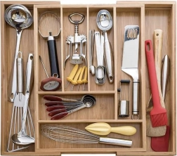Vícekomorové uspořádání udrží příbory a náčiní přehledně oddělené a okamžitě po ruce. Přírodní vzhled doplní moderní i klasické kuchyně.