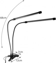 Tato praktická dvouhlavová grow lampa s 40 LED diodami kombinuje červené (630 nm) a modré (470 nm) spektrum, které podporuje fotosyntézu, zakořeňování, růst i květ. Díky flexibilním husím krkům snadno nasměrujete světlo přesně tam, kde ho rostliny potřebují, a klipem ji připevníte na polici či stůl.