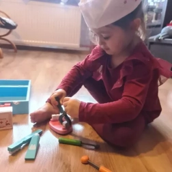 Tato komplexní lékařská a zubní sada v pevném dřevěném kufříku nabízí dětem realistické pomůcky k nácviku vyšetření i péče o zoubky. Díky praktickému uspořádání a široké škále nástrojů se děti přirozeně učí poznávat tvary, barvy a zdravotnické úkony formou hry.