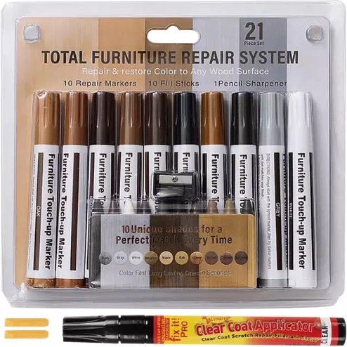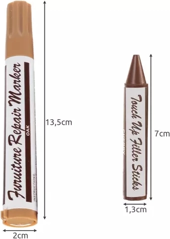 Opravování škrábanců na nábytku nikdy nebylo snazší. Díky naší sadě na opravu můžete naplnit hlubší trhliny voskem a poté dotvořit strukturu dřeva pomocí odpovídajícího barevného markeru.