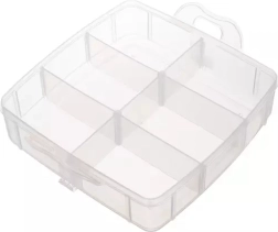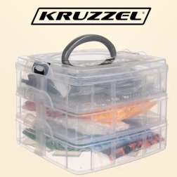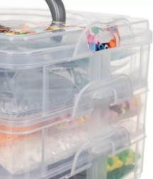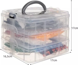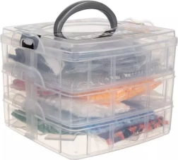 POUZDRO / ORGANIZÁTOR S DRŽADLEM –celek je zabalen v 3patrovém organizéru, 2 patra majípřihrádky na korálky a ve třetím patře je otevřená přihrádka na příslušenství.Všechna patra jsou uzavřena na západky a organizér má rukojeť pro přenášení.