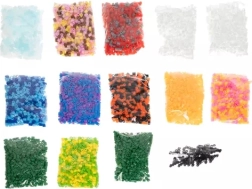SOUBOR65,00KORÁLEK- sada obsahuje 20 různých barev korálků: bílá, zelená, žlutá, akvamarínová, mléčná, ledová, tmavě modrá, modrá, fialová, černá, oranžová, zářivě oranžová, růžová, červená, šedá, nahá, hnědá, pastelově oranžová, pastelová růžové, žluté.Jedna sada 6500 ks. umožňuje vytvořit mnoho figurek.
