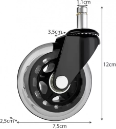SPECIFIKACE- materiál: pryž / kov; velikost čepu: 11x22mm; průměr kola: 7,5cm; rozměry: 12 x 3,5 x 1,1 cm; maximální zatížení na kolo: 50 kg; hmotnost soupravy: 1,040 kg; hmotnost v balení: 1,147 kg.