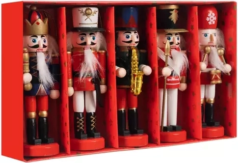 Každý louskáček má unikátní ozdoby, včetně hudebních nástrojů či žezla, což dodává na zajímavosti a rozmanitosti.