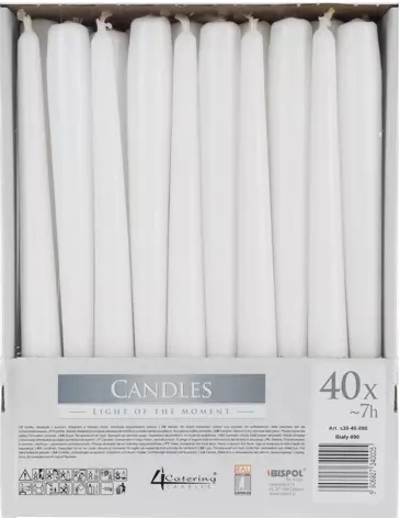 Elegantní bílé kónické svíčky pro každou příležitost. Sada obsahuje 40 kusů s průměrem 2,3 cm a výškou 24,5 cm, vhodné do svícnů i luceren. Díky kvalitní parafínové směsi nabízejí dlouhou dobu hoření až 7 hodin, čisté hoření a nadčasový dekorativní vzhled pro svatby, oslavy i domácí atmosféru.