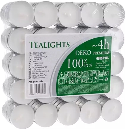 Praktické čajové svíčky v kovových kalíšcích s dobou hoření cca 4 hodiny v ekonomickém balení 100 kusů. Ideální pro dekorace, aroma lampy, ohříváčky jídel i vytvoření pohodové atmosféry doma, v restauraci či SPA. Díky parafínové směsi hoří stabilně a čistě a kovová miska brání vytékání vosku.