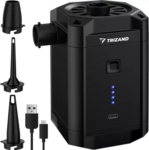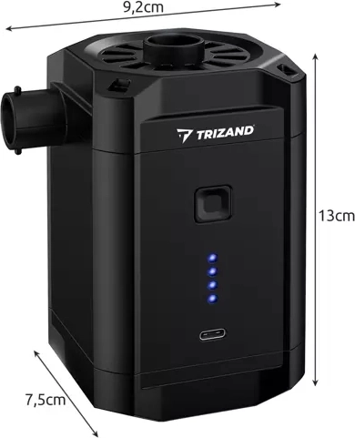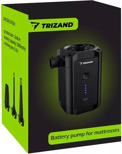 Bezdrátová akumulátorová pumpa Trizand je užitečným pomocníkem na každé cestě. Díky třem výměnným nástavcům si poradí s nafukováním matrací, míčů, pontonů a dalších nafukovacích předmětů. Je kompaktní a snadno přenosná, což z ní dělá perfektního společníka na kempování či na pláž.