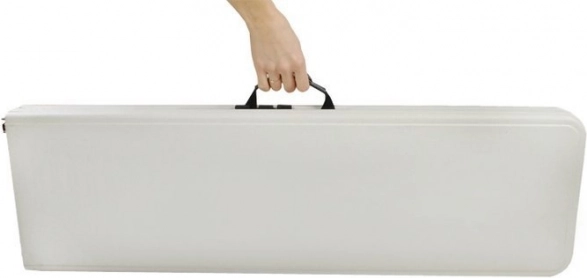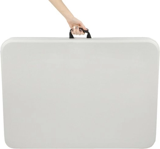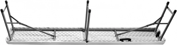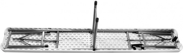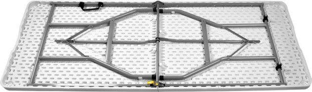 Stůl má stabilní ocelovou konstrukci obalenou práškovou barvou a odolnou plastovou desku, což jej činí odolným vůči dešti a sněhu. Po složení je snadno přenosný a skladovatelný, ideální na cesty či pro uskladnění v garáži.